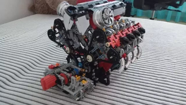 Der Twin-Turbo-Look mit Leitungen sowie der Auspuffkrümmer bilden die typische Hochleistungs-Peripherie nach. Die elektrische Rotation setzt Kolbenhub, Ventiltrieb und Scheiben synchron in Bewegung.