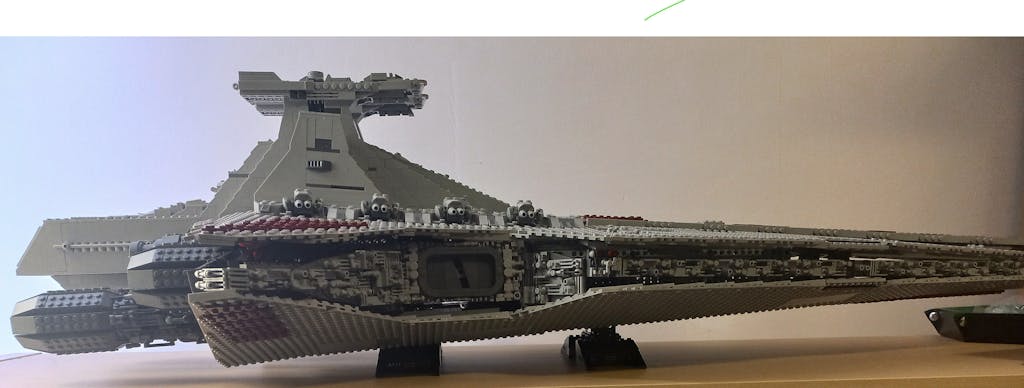Mit dem Mould King 21005 holst Du Dir den ikonischen Venator-Klasse Angriffskreuzer als über einen Meter langes Raumschiffmodell auf den Bautisch. Das fertige Modell misst ca. 115 × 52 × 32 cm (L×B×H) und setzt die Silhouette des Kreuzers mit sauber geführten Paneelen, der roten Streifenführung und einer kraftvollen Hecksektion überzeugend in Szene.